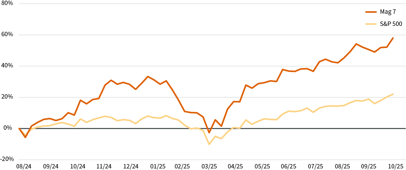 Relative performance of the Magnificent 7 and the broader S&P 500: August 2024 – October 2025
